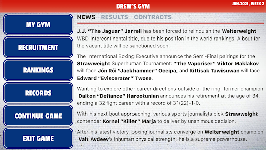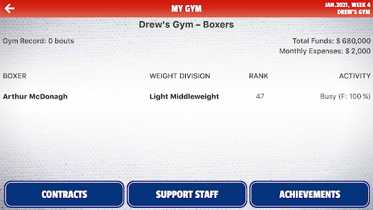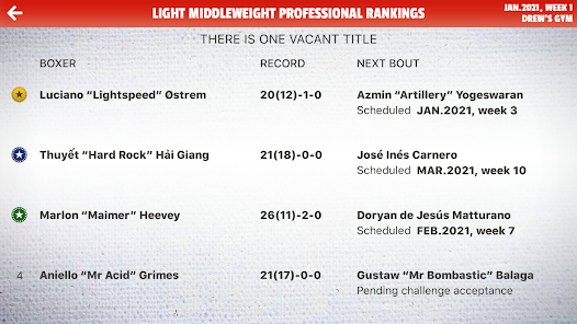 Jadilah pengurus tinju pemula dengan sesuatu yang dapat dibuktikan: merekrut amatir muda yang menjanjikan, profesional yang mapan atau veteran yang sudah bersara, mencabar lawan yang menguntungkan, dan melatih pejuang anda untuk pertarungan yang akan datang. Pertarungan menang atau kalah bergantung pada strategi dan taktik yang anda buat, jadi sangat penting untuk menganalisis kedua-dua pejuang anda dan lawan anda untuk membuat rancangan pertarungan yang betul. Pertarungan yang menang akan menaikkan kedudukan petinju anda masing-masing, untuk akhirnya mencabar tali pinggang kejuaraan dunia itu sendiri.